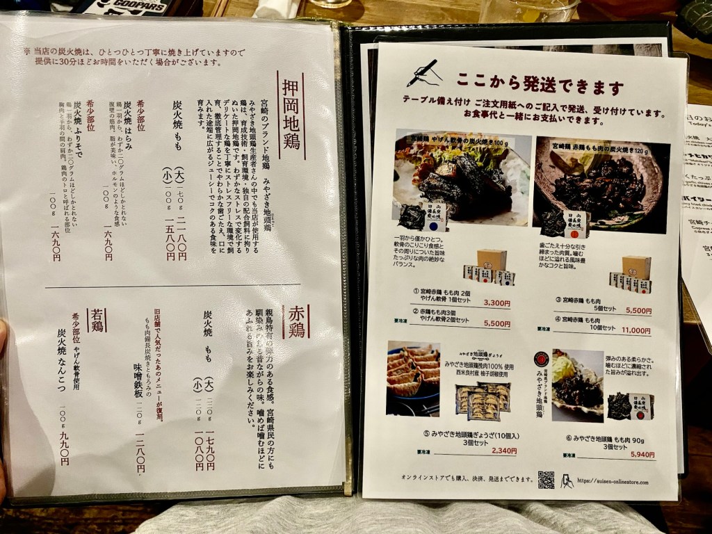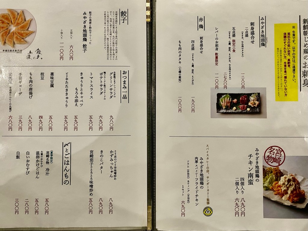 • 主なメニュー: 地鶏の炭火焼(もも、希少部位)、地頭鶏餃子、チキン南蛮、鶏刺し(未注文)、スパイシーメヒカリなど。地鶏と海産物、宮崎グルメを網羅。(Webサイトにて「新鮮朝じめ鶏の刺身」も提供している旨を確認)