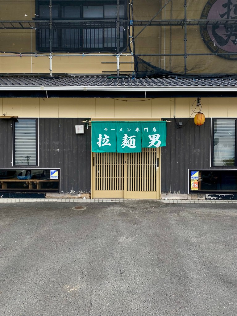 店舗の外観は、黒っぽい木目の壁に黄土色の屋根の和風な造りである。緑色の暖簾に「ラーメン専門店 拉麺男」と書かれているのが目印だ。訪問時は外壁補修中であった。