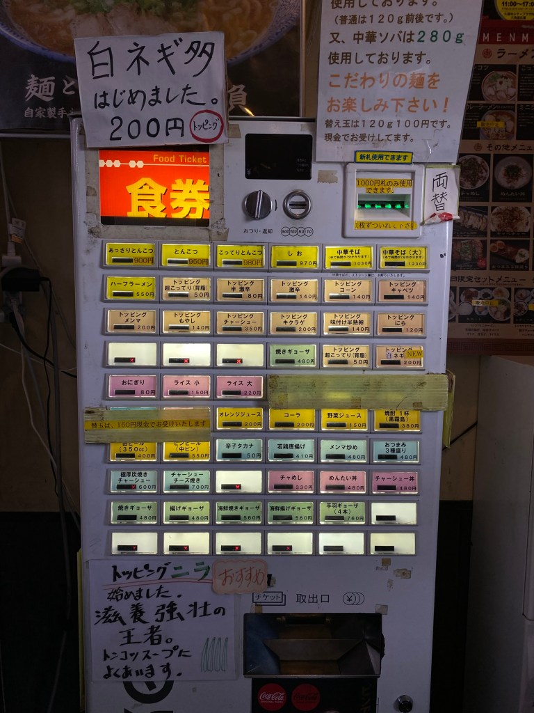 入ってすぐの場所にある券売機で食券を購入する。メニューには「あっさりとんこつ」「とんこつ」「こってりとんこつ」などのラーメンの他、様々なトッピングやサイドメニューが並ぶ。