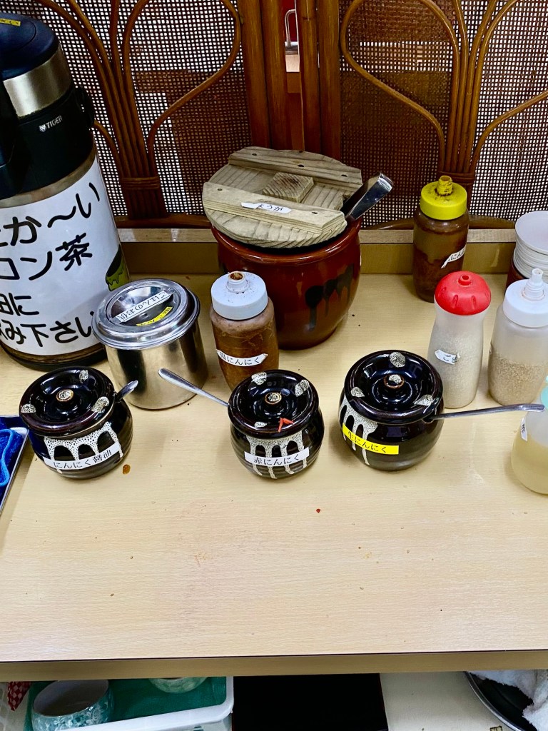 店内に入ってすぐ正面には、様々な調味料が置かれたセルフコーナーがある。特に、大きな容器に入っているニンニク醤油は「宮崎ラーメンのマストアイテム」とされており、多くの客が利用する。その他、一味唐辛子や紅生姜などのトッピングも用意されている。