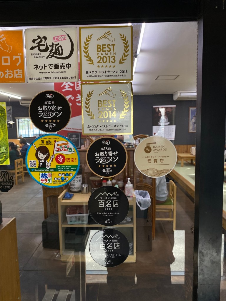 入口のドアには、食べログの「ベストラーメン」や「百名店」など、数々の受賞歴を誇るステッカーが多数貼られており、その人気ぶりがうかがえる。
