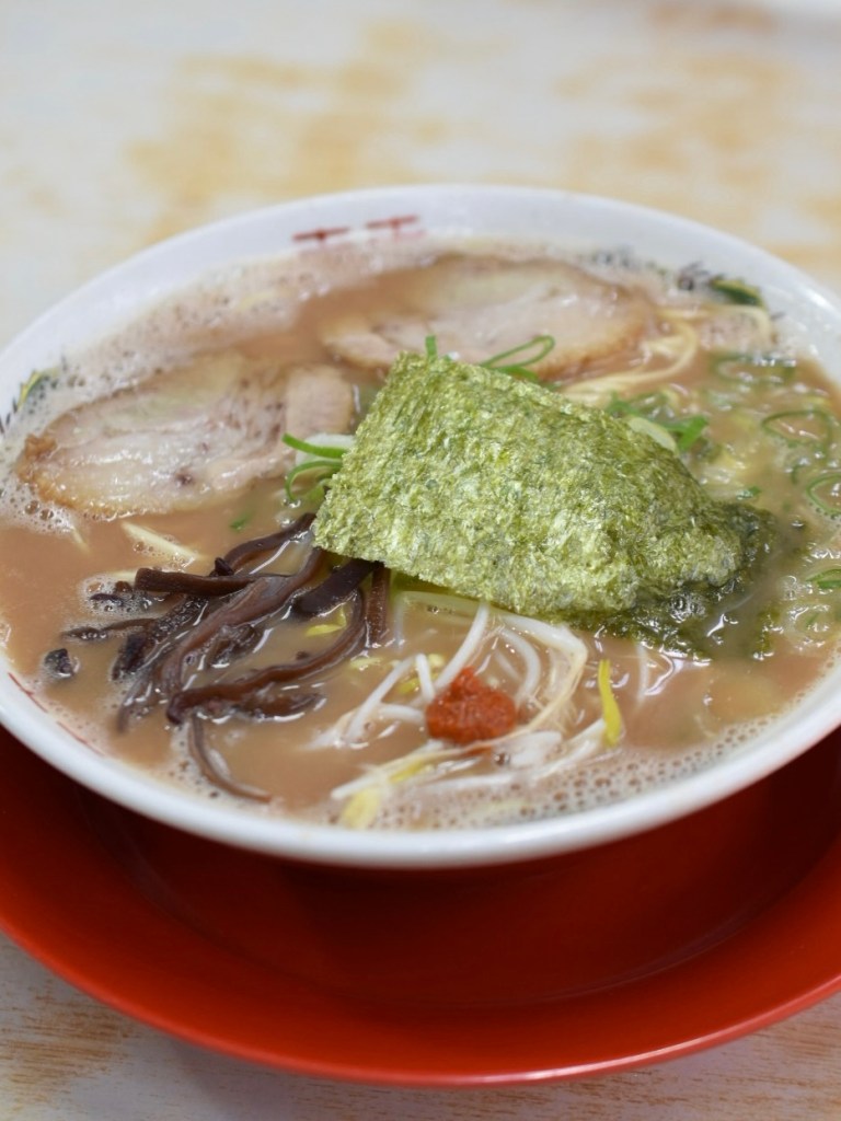 茶褐色で泡立った濃厚なスープに、チャーシュー、キクラゲ、もやし、青ネギ、そして大きな海苔がトッピングされている。麺は低加水率の細めストレート麺が使用されている。