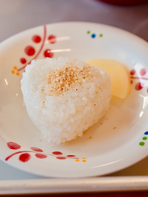 ふりかけがかかったおにぎりと、お漬物(たくあん)。
