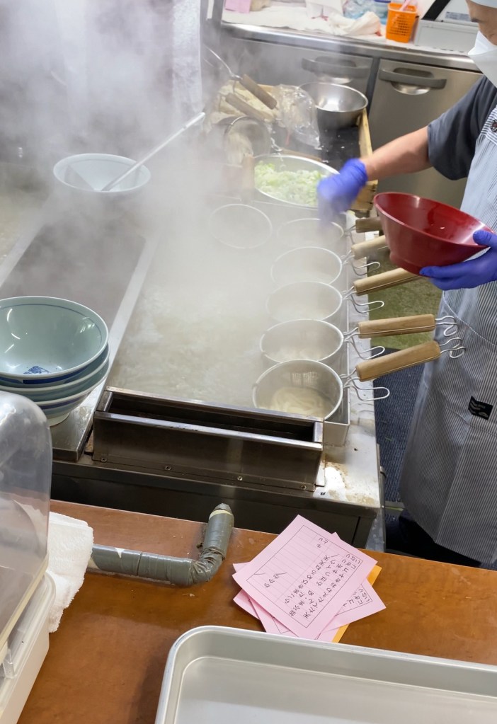 注文をお伝えするや否や(いやその前から)茹でられているうどん。そしてうどんつゆ。手際よく作業されていて、それを見るだけでワクワクが止まらない。